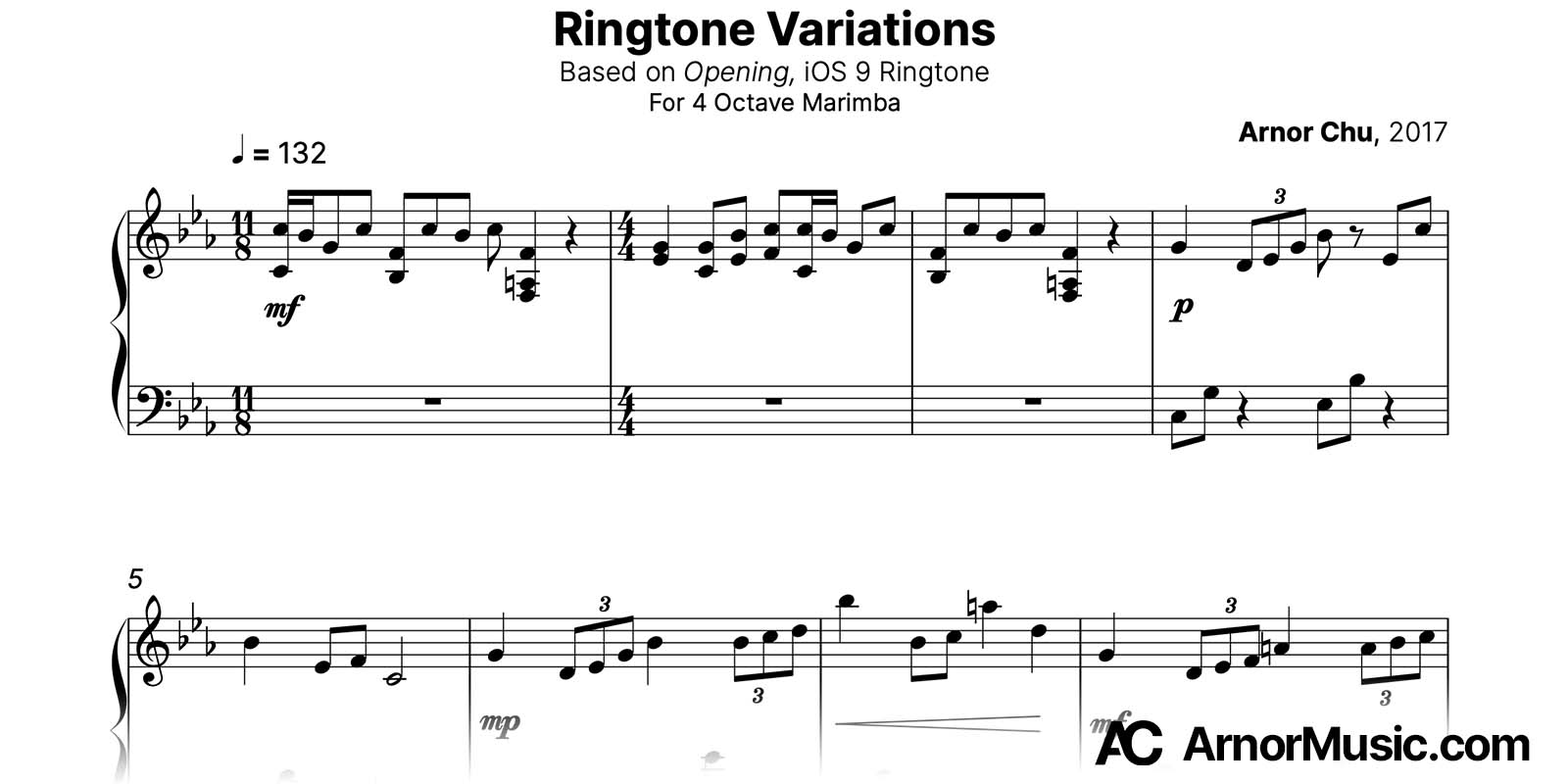 Based on the iOS 9 iPhone default ringtone, Opening, Ringtone Variations is a short one minute piece that utilises the theme of the ubiquitous ringtone and develops it a little further. Requires proficiency in double-lateral strokes and strong mallet independence. Aimed at intermediate players.